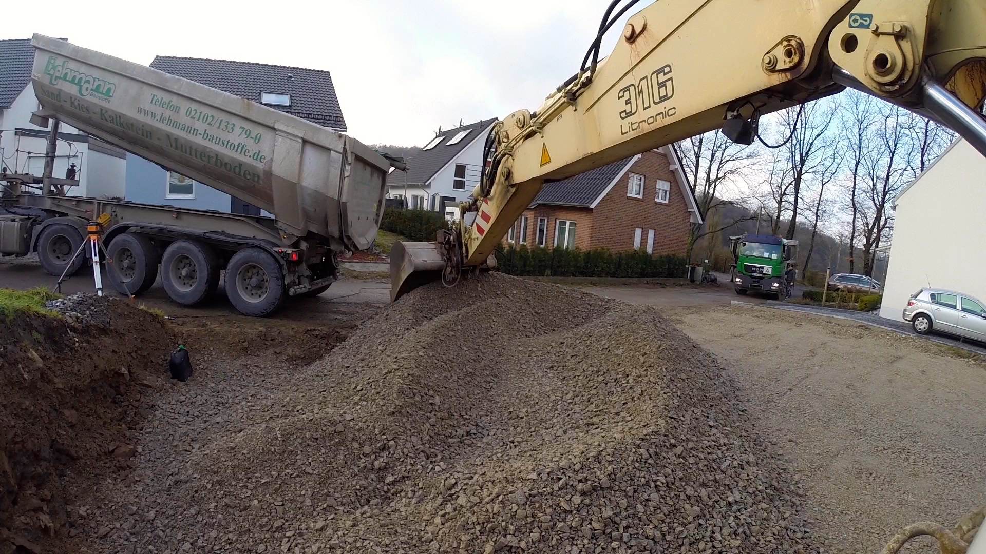 Es musste enorm viel Erde (ca. 600 cbm) bewegt werden, um die Gründung für die Bodenplatte vorzubereiten. Es wurde etwa 1,50m ausgekoffert und anschließend 60cm wieder mit Kalksandstein verfüllt und verdichtet. Alleine dafür kamen 13 Ladungen Material per Sattelschlepper! Der Aushub wurde temporär im hinteren Teil des Grundstückes gelagert, was im Nachhinein ein absoluter Fehler war. Grund war das zu dem Zeitpunkt fehlende Ergebnis der Bodenanalyse. Ohne die Klassifizierung des Aushubs ist eine Entsorgung legal nicht möglich. Allen angehenden Bauherren sei an der Stelle empfohlen, eine Bodenanalyse rechtzeitig erstellen zu lassen, damit der Aushub direkt aufgeladen und entsorgt werden kann. Wir mussten die Erde so zweimal „anfassen“ und – da das Haus später dann schon im Weg war – über das Nachbargrundstück abfahren.